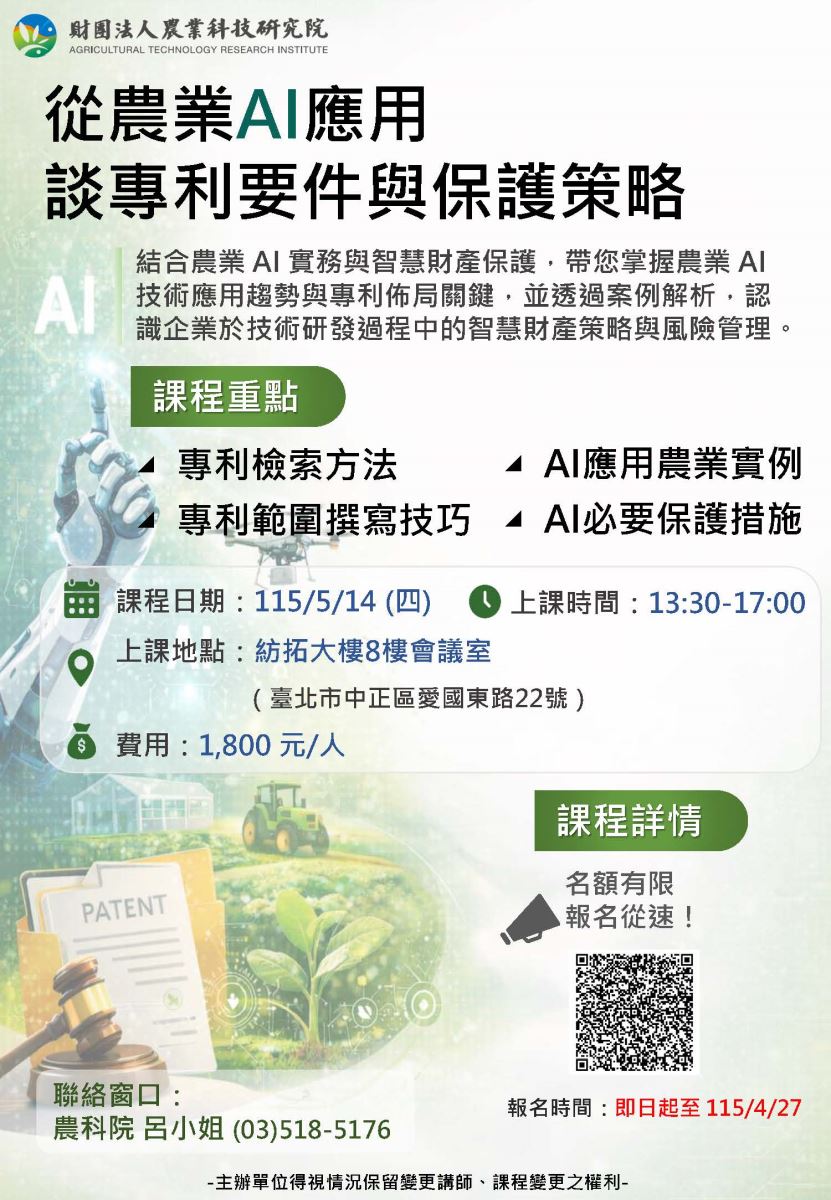 結合農業AI實務與智慧財產保護,帶您掌握農業AI技術應用趨勢與專利佈局關鍵,並透過案例解析,認識企業於技術研發過程中的智慧財產策略與風險管理